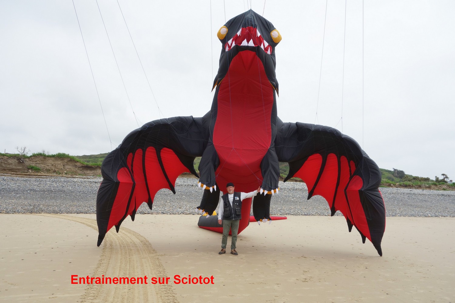 Sciotot le 7 mai 2023 :Petit entraînement pour le Festival d'Houlgate Plein Vent des 13 et 14 mai 2023. On a sorti le dragon cet après midi sur Sciotot malgré un vent un peu faible pour son gabarit, au moins il aura pris un l'air avant le festival.